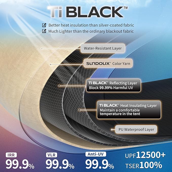 - Blackout Tent: Made of 150D TI BLACK TECHNOLOGY fabric (UPF12500+), which is Better heat insulation than silver-coated fabric, and much Lighter than the ordinary blackout fabric; IRR 99.9%, VLR 99.9%, TSER100%, it helps block 99.9% harmful UV, maintain a comfortable temperature in the tent, you can have a good rest in the tent.