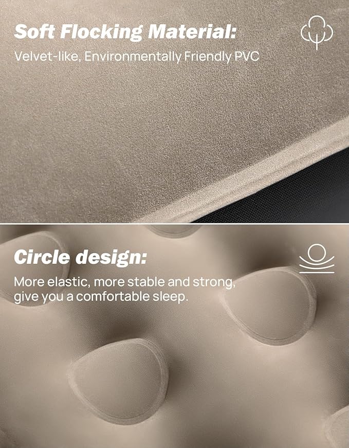 - 【Cavity Design】: Featuring three independent air chambers, our design significantly reduces the risk of air leakage while enhancing durability and longevity. The surface and pillows are crafted from a soft, velvet-like flocking fabric for a plush feel, and the high-quality PVC bottom helps prevent leaks.
