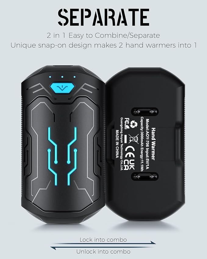 - 𝐇𝐈𝐆𝐇-𝐏𝐄𝐑𝐅𝐎𝐑𝐌𝐀𝐍𝐂𝐄 & 𝐒𝐀𝐅𝐄𝐓𝐘 𝐂𝐄𝐑𝐓𝐈𝐅𝐈𝐄𝐃: Crafted from advanced lithium batteries, aluminum, and ABS materials, these hand warmers are certified with UL, CE, and FCC, ensuring high-performance and safety. The built-in intelligent protection system guards against power fluctuations, short circuits, and overloads, providing you with peace of mind.
