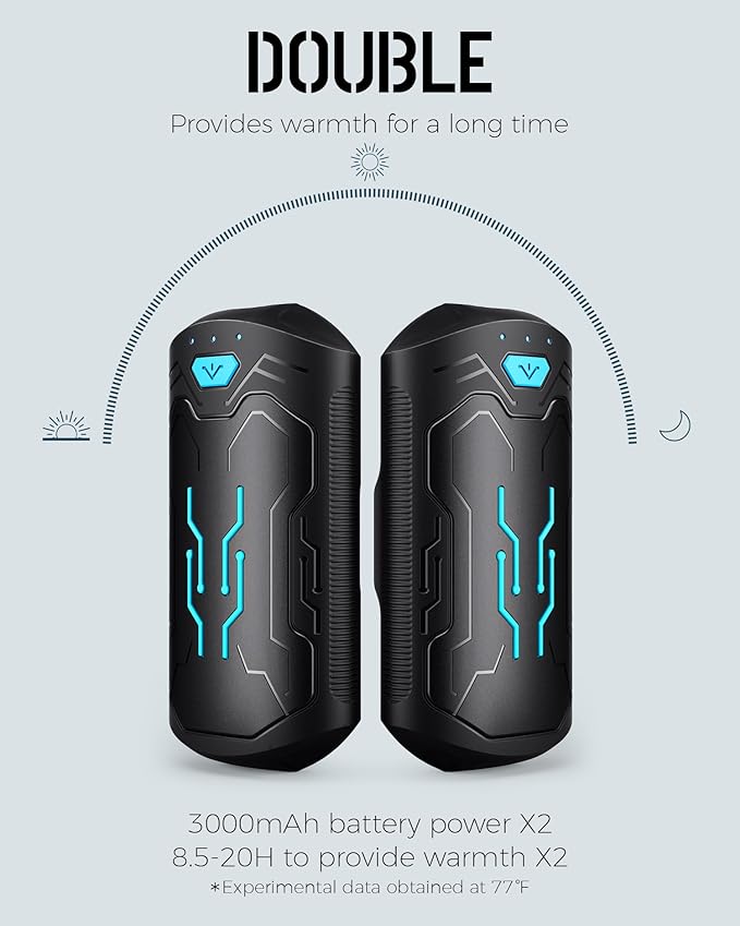- 𝟐𝟎 𝐇𝐎𝐔𝐑𝐒 𝐎𝐅 𝐂𝐎𝐍𝐓𝐈𝐍𝐔𝐎𝐔𝐒 𝐖𝐀𝐑𝐌𝐓𝐇: Our 2-pack hand warmers can last for 20 hours on a single charge. For outdoor enthusiasts, this means you can confidently embark on long hikes, camping trips, or fishing adventures without the hassle of frequent charging. Stay warm throughout the day.