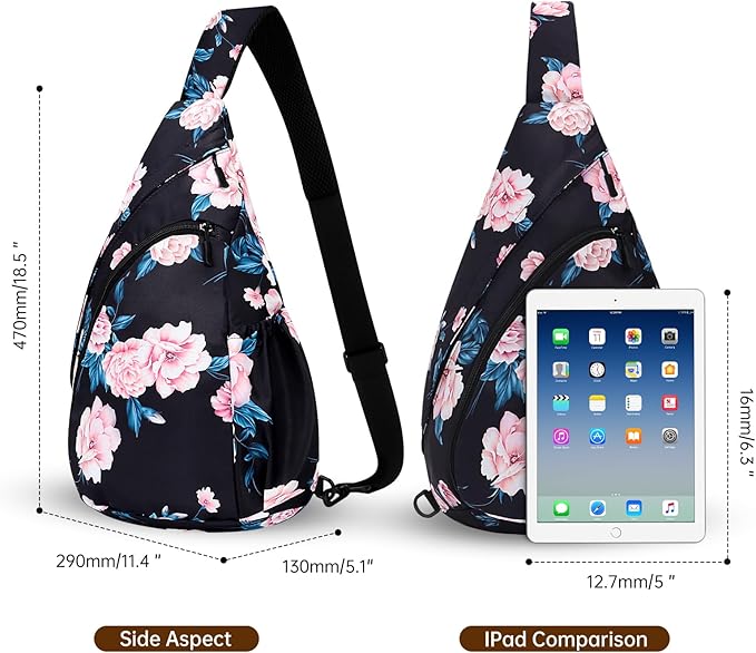 - ADJUSTABLE & COMFORTABLE FIT--Measuring 11.4" x 5.1" x 18.5", this unisex sling backpack fits most adults. The adjustable shoulder strap (26.8" to 38.2") is made of breathable, sweat-resistant fabric, reducing shoulder pressure and ensuring comfort in hot weather.