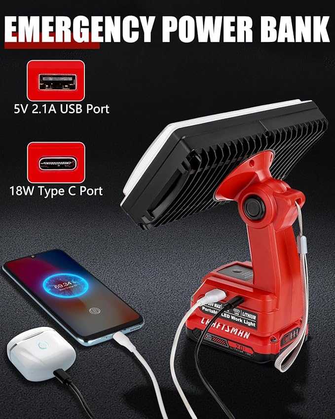 - 【USB Port & 110° Rotating Head 】—— This Craftsman 20v light with 5V/2.1A USB port and 18W TYPE C port can charge your phone, fan and any other USB electronic devices.This item for Craftsman light 20v max led work light with 110° pivoting head projected in multiple directions. This construction light is compact and easy to carry and store.