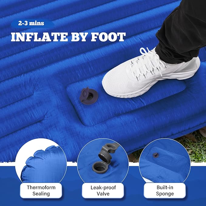 - EASY TO INFLATE AND DEFLATE: We are committed to saving you time and energy after a tiring journey. With a built-in pump, you can have a wide double sleeping pad in 2-3 minutes by rhythmically inflating it with your foot. Open the deflation valve behind the pillow and roll up the backpacking sleeping pad, the air inside will be quickly released