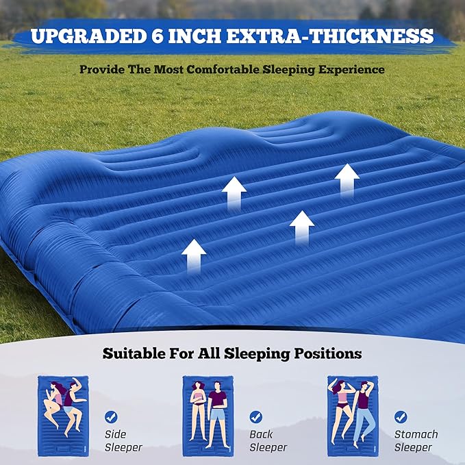 - EXTRA THICK MAT: Are you still suffering from the narrow and thin sleeping mat with your companion? If you pursue high sleep quality, you'll love this double camping mattress! The 6-inch thickness can hold the weight of two adults away from hard ground; the spacious size of 78.7*51" provides you with excellent comfort experience
