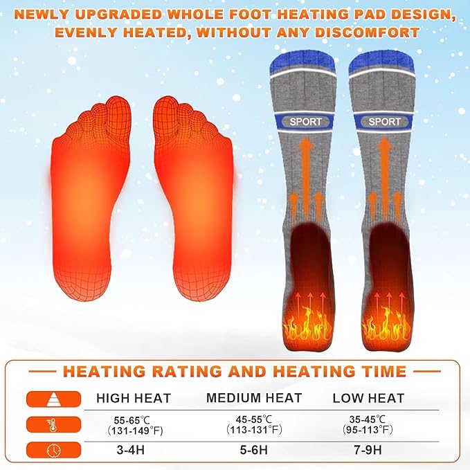 - ❄【3 Levels Heating Settings Electric Socks】: These heated socks for men and women With three temperature settings, include High (140°F), medium (122°F), and low (104°F) settings, you can easily adjust the heat to suit your preferences. Choose between high, medium, and low temperatures to ensure your feet stay warm and comfortable in any weather condition.