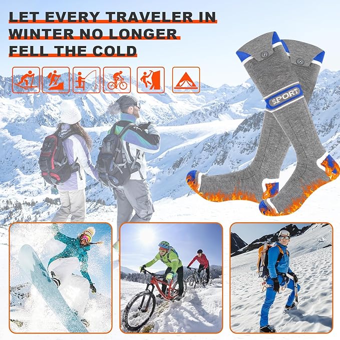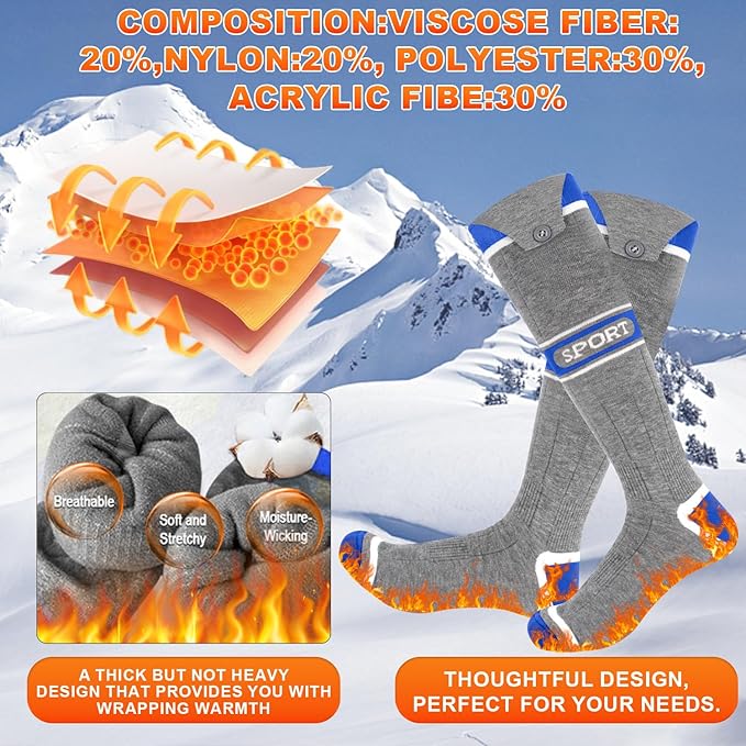 - ❄【Comfortable and Breathable Heated Socks】: Made with premium materials, our heated socks are not only warm but also highly breathable. They provide a comfortable fit and excellent sweat absorption and moisture-wicking effects, keeping your feet dry and odor-free.The snug fit and thermal insulation keep your feet cozy without compromising flexibility or mobility.