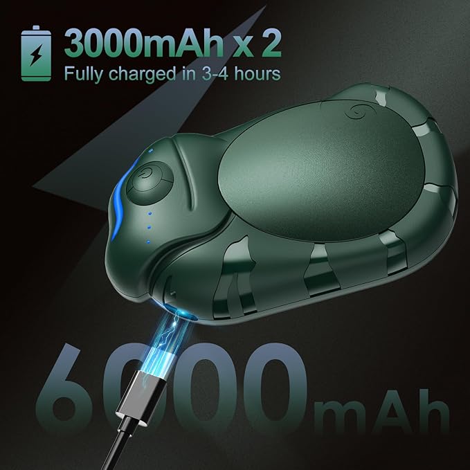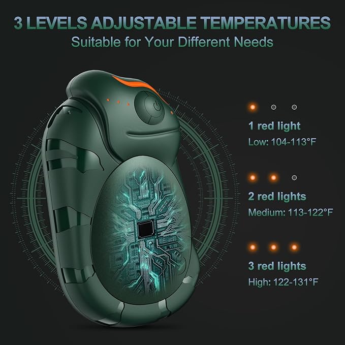 - 【2s Fast Heating & 3 Levels】Press the chameleon eyes to instantly release warmth for you. 2s fast heating and 3 levels of temperatures 104-113°F/113-122°F/122-131°F at your choice for a stable, adjustable and precise comfortable heat. The high, medium, and low settings provide 18-20, 12-14, and 8-10 hours of heat respectively. Please kindly note that the battery drains faster at higher temperature settings. So, just how long the battery really lasts depends on how you use the hands warmer