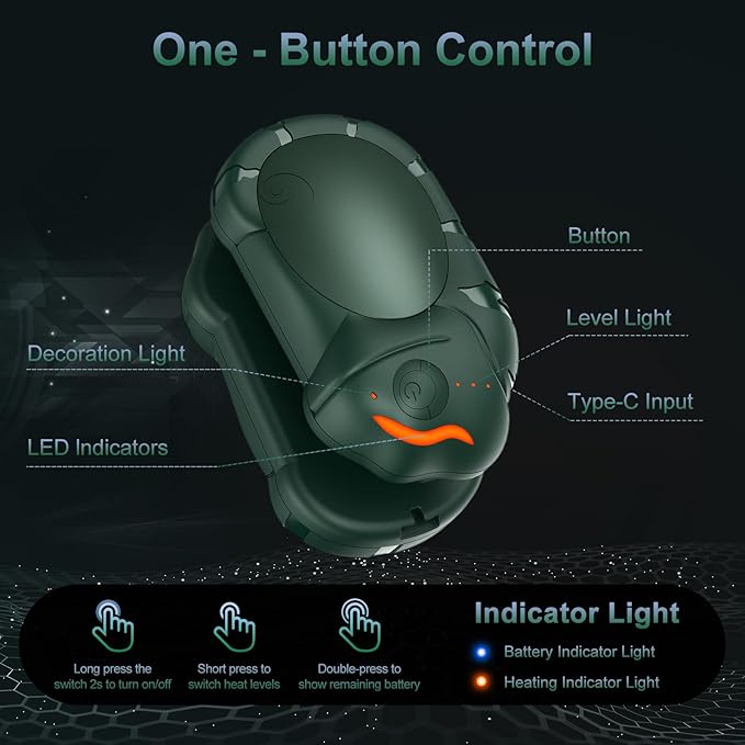 - 【One Button Control】 1. Press and hold the chameleon eyes 2s to turn on/off the hand warmers. 2. The red light on means it is working, short press in sequence to adjust the 3 temperature levels. 3. Double-click the chameleon eyes to check remaining battery while working (the blue light is on). 1 blue light battery less than 30%, 2 blue lights battery less than 60%, and 3 blue lights battery less than 100%. Convenient and easy to operate