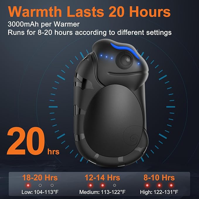 - 2Sec Rapid Heat & 3 Heating Levels --- Rapid warms up quickly in 2 seconds and releases heat continuously, warming your hands without waiting. Offer 3 distinct temperature settings, ranging from a gentle 104-113°F for a mild, comforting warmth, to 113-122°F for a cozy heat, and all the way up to a toasty 122-131°F. Adjustable levels ensure that you can choose the heat precisely to your needs.