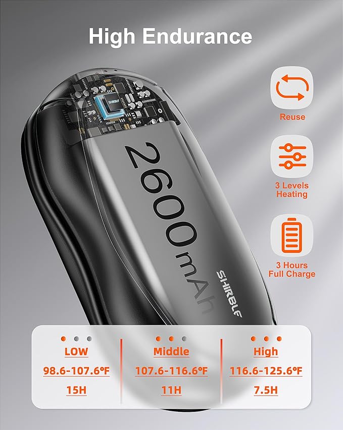 - 【Rechargeable & Three Levels of Temperature】Electric hand warmers, 5200mah rechargable hand warms with up to 12 hours battery life, USB hand warmer. With 3-speed indicator light, you can adjust three different temperatures, the use of time is 7-9.5-12 hours. Choose the right temperature for a comfortable using experience.