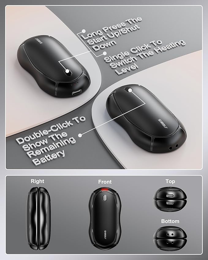 - 【Battery Level Alert】Double tap the on button at the top of the rechargeable heater to check the power level. When the handwarmer is low on power during use, the indicator lights on both sides of the on button will blink to indicate this. Remind to charge in time for next use.