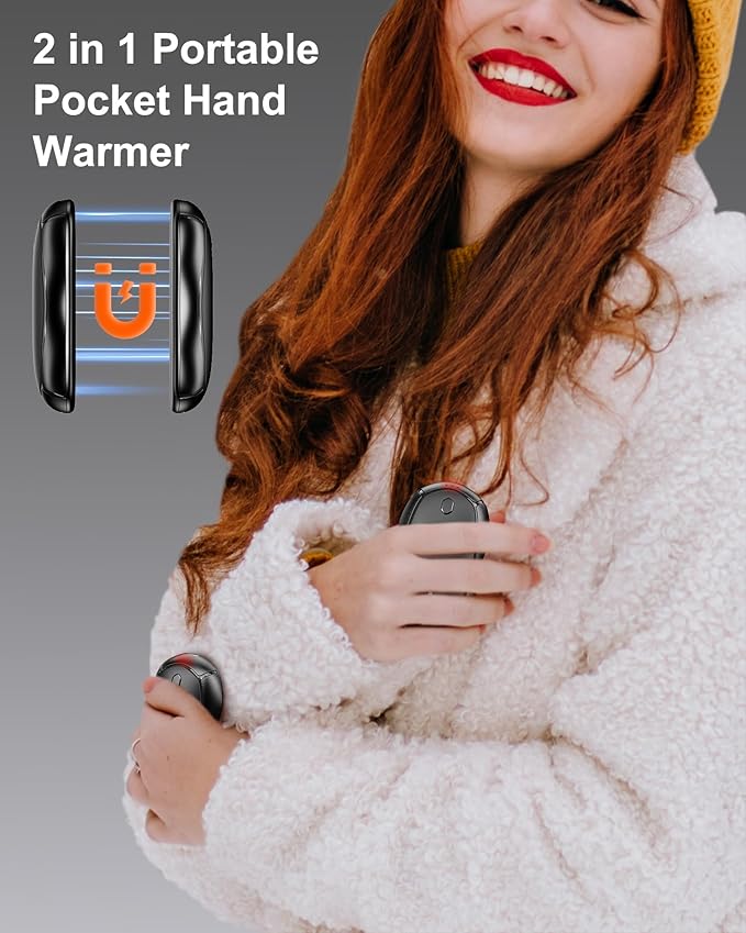 - 【2-in-1 Magnetic Design】This rechargeable hand warmers 2 pack is designed with magnetic attraction, it can be divided into two for independent heating, and portable hand warmer for easy storage. This pocket warmers has a unique shape and feels comfortable to use. Use it as a camping hand warmers and share it with your friends and family.