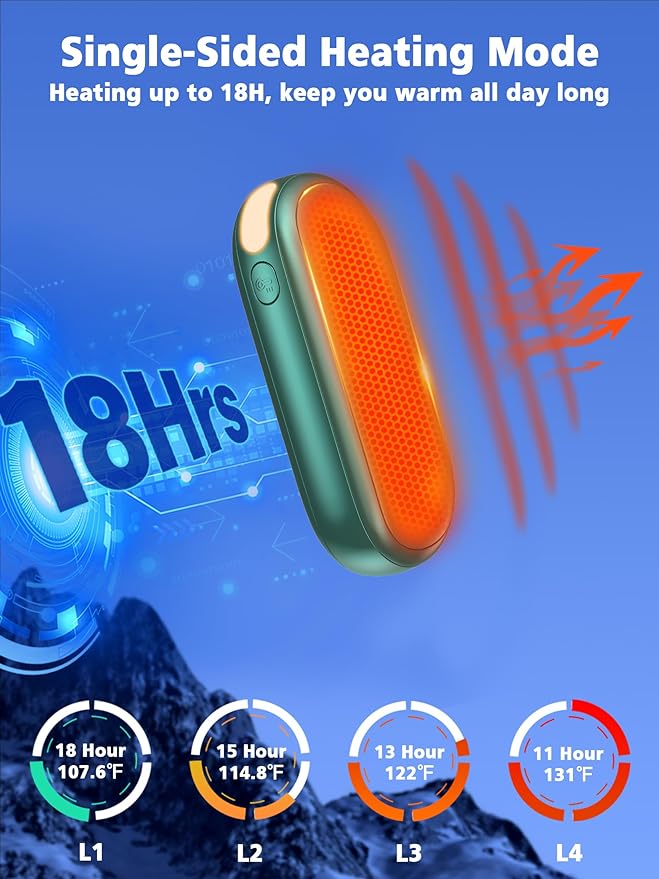 - Provides Warmth for a Long Time: This rechargeable hand warmers total is 7000mAh. It can be fully charged in 3-4 hours and can provide up to 18 hours of continuous warmth! When you use single sided heating mode, it can be used up to 18 hours, and when you use double sided heating mode, it can be used up to 8 hours. Say goodbye to the hassle of frequent charging and ensure you stay warm all day long