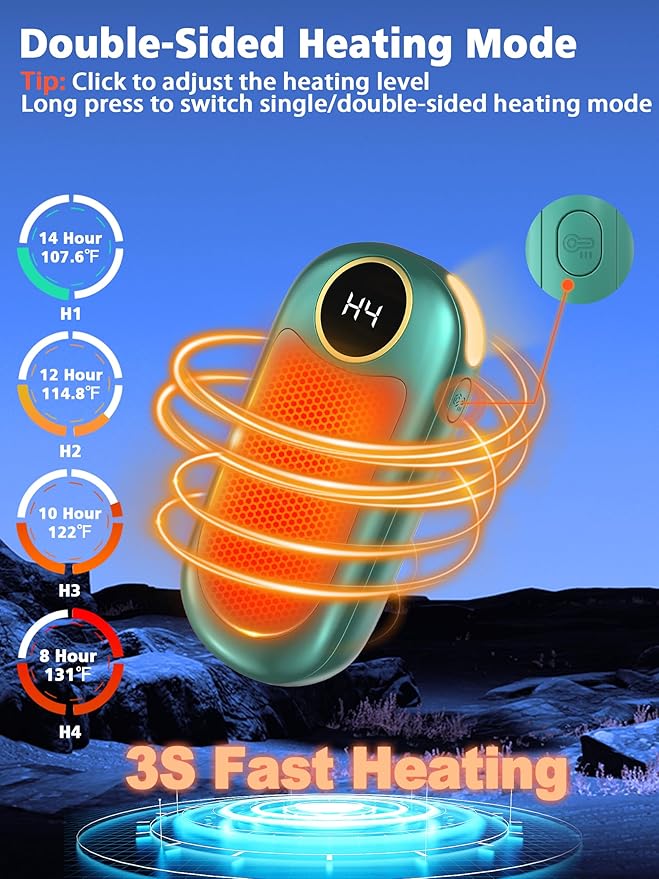 - 2 Sided Heating & 4 Heating Levels: The hand warmer reusable has 8 heating modes, 4 heating levels, and can heat up to 131 ℉. L1/L2/L3/L4 for single sided heating. H1/H2/H3/H4 is used for double-sided heating. Rechargeable hand warmer heats up quickly in 2 seconds. With the help of the LED display, you can check the remaining power and easily adjust the heating mode, free your battery anxiety
