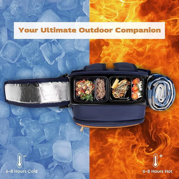 - LARGE CAPACITY & WELL EQUIPPED: Size: 12(L)x7.5(W)x15(H) inches, 5.2 lb; The 22L high-capacity picnic backpack big enough to accommodate the ingredients needed for a picnic. Includes a full set of camping accessories: backpack cooler, picnic blanket, wine bag, cutlery and cutting board, etc. The camping backpack bag is made of 100% polyester fabric and 5mm PE foam and PU layer, which can keep the hot/cold/fresh for hours.