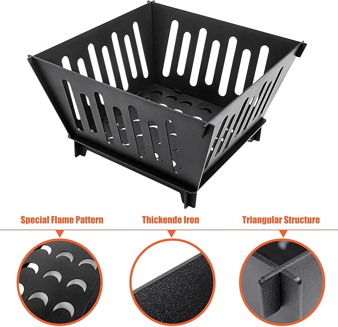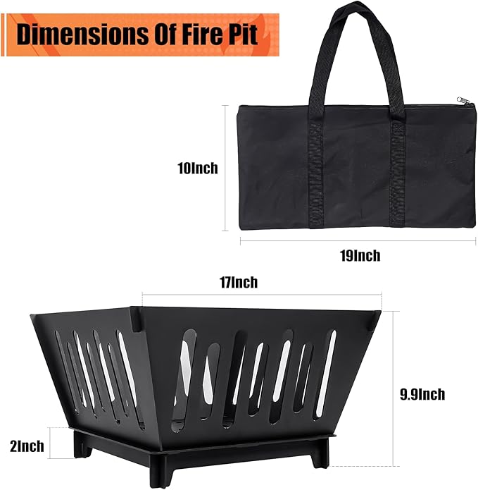- Fire Pit Dimensions: The fire pit measures 17x17x11 inches, with a height of 2 inches at the base.