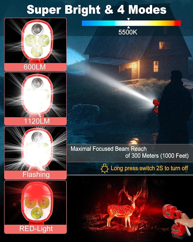 - 【4 Lighting Modes】—Simply press the work light switch to adjust between Low Brightness Mode - 600LM, High Brightness Mode - 1120LM, Flashing Mode - 1120LM,and Red-Light Mode. (Hold switch 2s to turn off light)