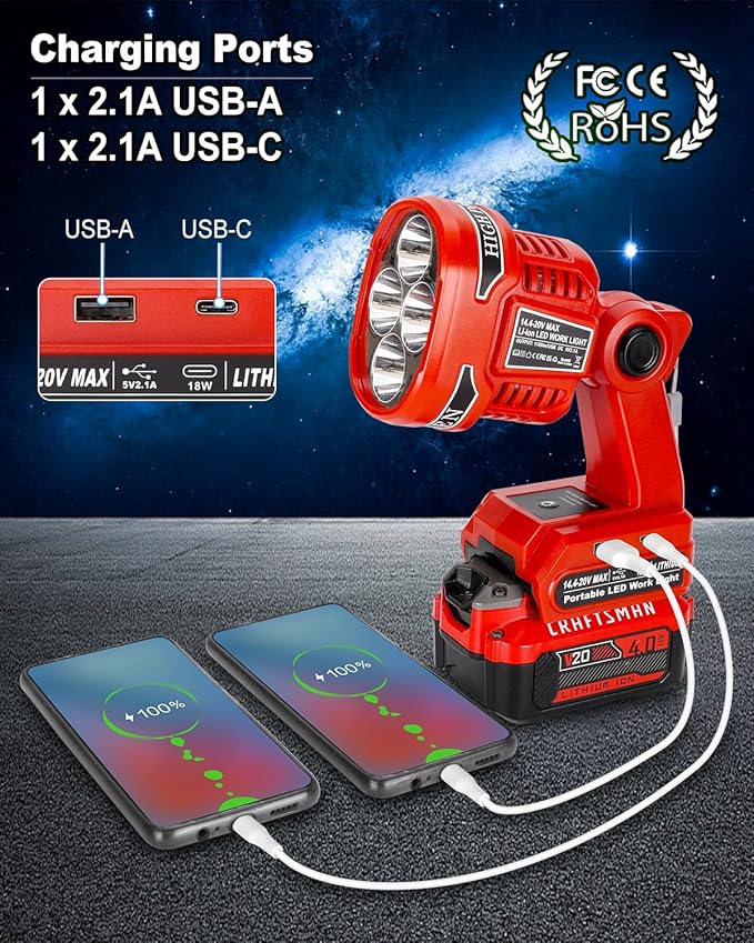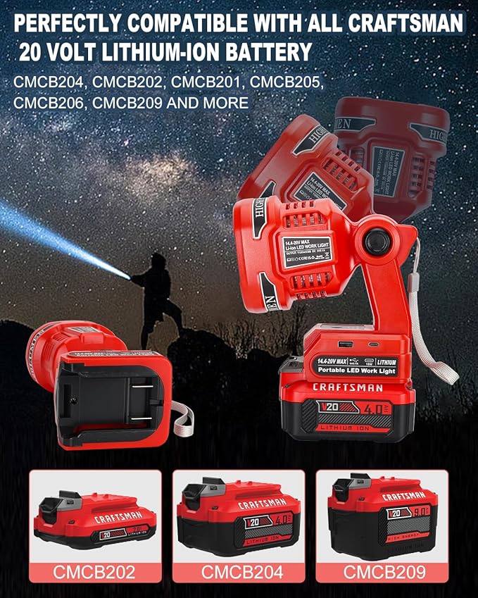 - 【Perfectly Compatible with Craftsman 20V Batteries】- Adisipsoarin LED spotlight powered by Craftsman 20 volt lithium-Ion battery CMCB204, CMCB202, CMCB201, CMCB205, CMCB206,CMCB209 cordless tools battery etc.(Batteries Not Included)
