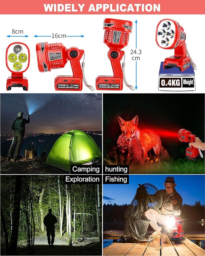 - 【1120LM-6000k Super Bright LED Work Light】— Equipped with 3 white high-power LED high-brightness beads and 1 red light bead, with a professionally designed beam distribution, the focused beam achieves a max illum distance of 300 meters (1000 feet). Ideal for fishing, hunting, and emergencies.