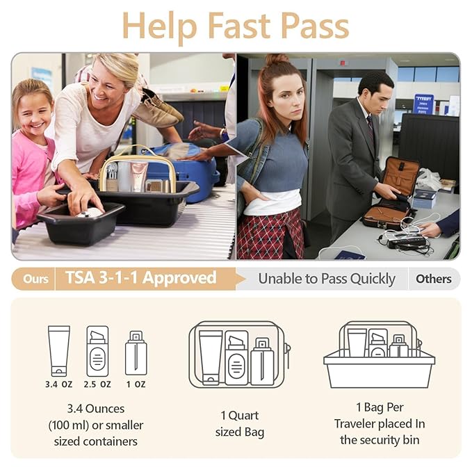 - TSA Approved, Meet Liquids Rule: The medium size clear makeup bag is 7.8 x 2.3 x 5.9 inch, it follows the TSA's 3-1-1 Liquid Rule published by TSA. You can quickly pass the airport security screening. Note: the large size clear bag is 9.8 x 3.1 x 6.6 inch, it is larger than one quart and is not TSA approved