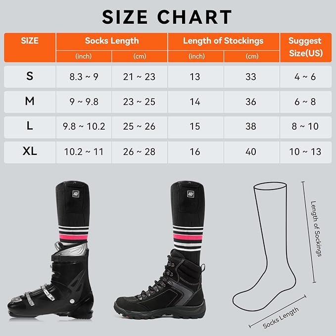 - 🔥Perfect Gift for Winter Activities: The rechargeable heated socks are suitable for various outdoor activities in winter, such as camping, hunting, hiking, skating, fishing, motorcycle, cycling, outdoor work, etc. Heated socks bring warmth to your loved ones, parents and friends. They are the perfect warm gifts for Thanksgiving, Christmas and Valentine's Day. Heated socks can also be used as Christmas stocking fillers!