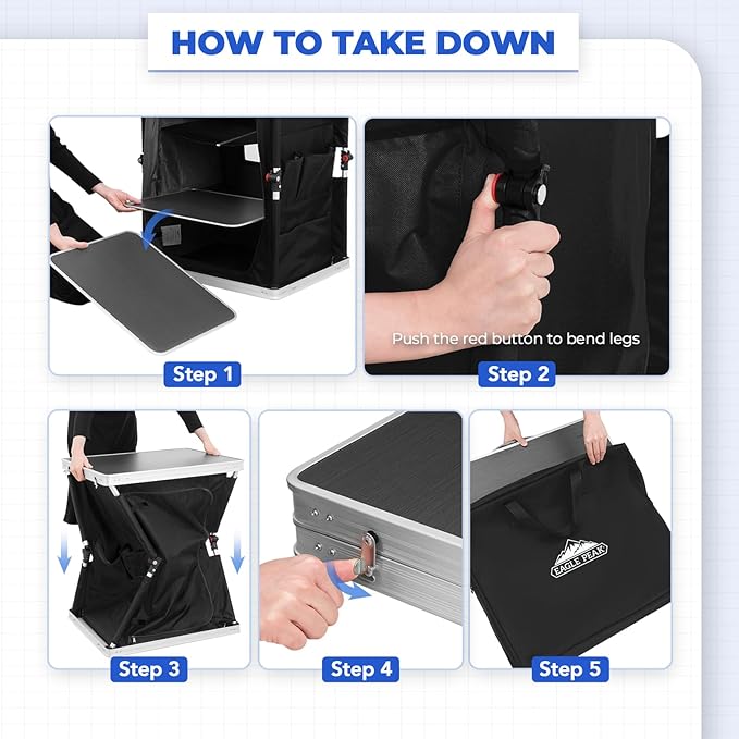 • EXCELLENT QUALITY: EAGLE PEAK camping kitchen table is made of durable MDF tabletop, waterproof and stain resistant material, and is easy to clean. The frame is made of anti-rust powder-coated aluminum pipe and polyester 600D with PVC coating. The aluminum alloy bracket with corner leg support system ensures the strong stability for long lasting use. This table supports up to 66 lbs.