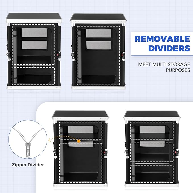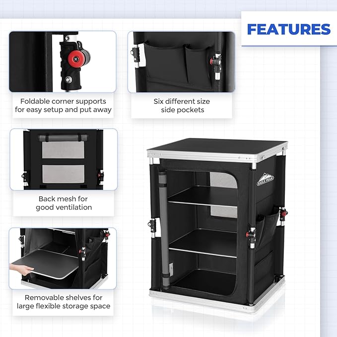 • BREATHABLE & EASY TO CLEAN: EAGLE PEAK portable camping table’s waterproof desktop and the 3 level shelves can be conveniently removed to clean when dirty. 2 mesh backside windows provide breathable airflow. NOTE:the table should not be used in the rain.