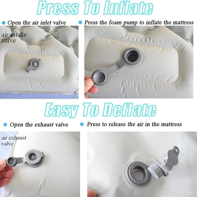 - 【EASY TO INFLATE/DEFLATE】Each double wide sleeping pad mattress has 2 valves, one for easy inflation with your feet or hands (no pump required) and the other for quick inflation and deflation