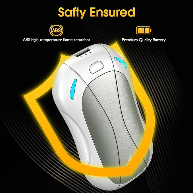 - [Safe and Durable] This hand warmer is made of high quality ABS high temperature flame retardant and oxygenated aluminium alloy material, including over-current, over-voltage, over-heat and short-circuit protection to ensure safe and worry-free use. The smart battery indicator light flashes when charging and stays on when fully charged.