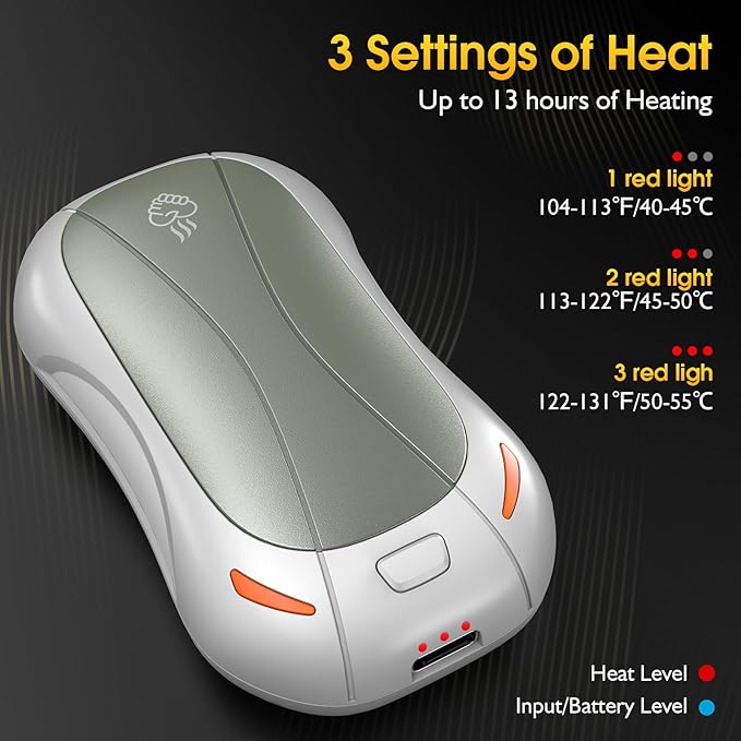 - [Three Levels of Instant Heating] FANDLISS 2pcs hand warmers don't need to wait for a long time, just press the switch, 1 second quick heating, immediately release the warmth for you. Three adjustable temperature levels (104-113°F/113-122°F/122-131°F) to meet your preference for warmth and comfort. Continuous heating time is long, providing you with long-lasting warmth on cold winter days.