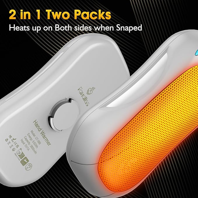 - [2-in-1 Portable Hand Warmer] FANDLISS rechargeable hand warmer with ergonomic split snap swivel design, small and portable pocket hand warmer can be put into any pocket or bag, you can heat your hands at the same time in the cold winter, or combined into one to meet the double-sided heating function, to meet your different needs in different situations!