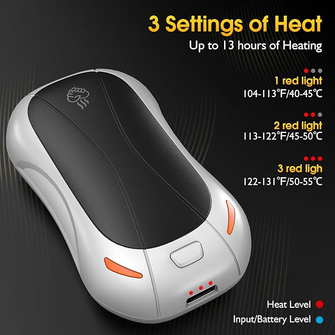- [Three Levels of Instant Heating] FANDLISS 2pcs hand warmers don't need to wait for a long time, just press the switch, 1 second quick heating, immediately release the warmth for you. Three adjustable temperature levels (104-113°F/113-122°F/122-131°F) to meet your preference for warmth and comfort. Continuous heating time is long, providing you with long-lasting warmth on cold winter days.