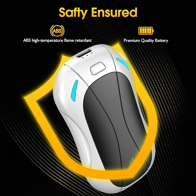 - [Safe and Durable] This hand warmer is made of high quality ABS high temperature flame retardant and oxygenated aluminium alloy material, including over-current, over-voltage, over-heat and short-circuit protection to ensure safe and worry-free use. The smart battery indicator light flashes when charging and stays on when fully charged.