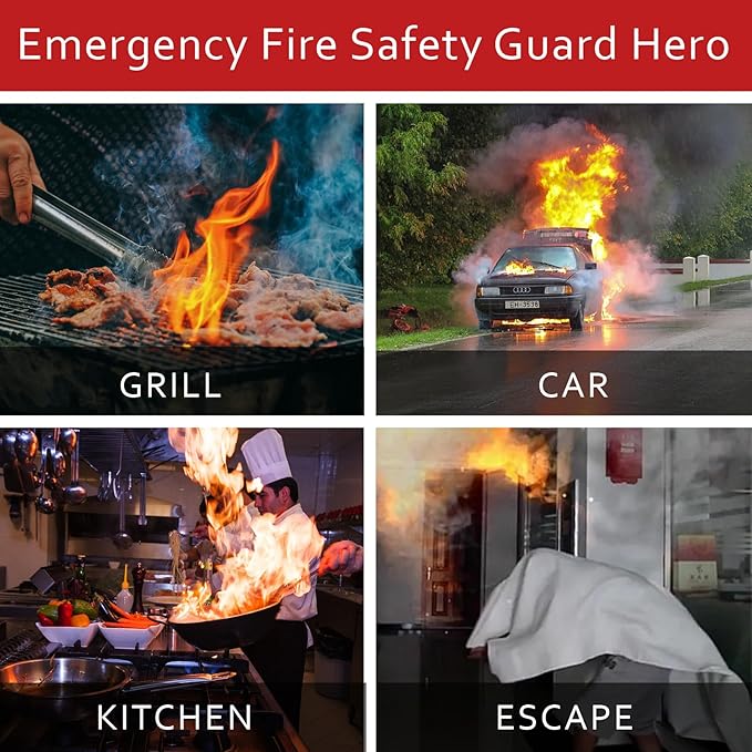 - 🔥Essential Survival Fire Blanket: Designed for liquid or grease fires, Works in different types of fire as well. The Fire Blanket is a must-have for emergency situations, providing reliable fire protection in your kitchen, backyard, and vehicle. This thick fire extinguisher blanket can also be used as a thermal or heat shield