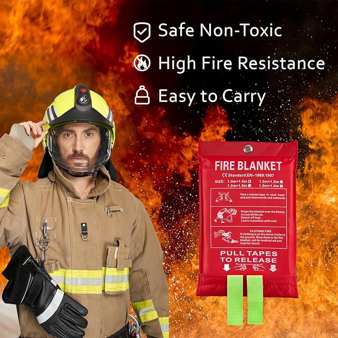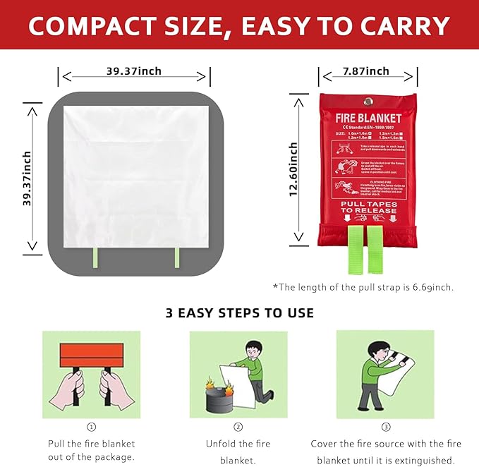 - CONVINIENT FOR DAILY USAGE: Unlike common fire extinguishers, this fire retardant blankets are effective for quickly smothering fires involving flammable liquids and clothing, and they can be used by anyone without training. Fire resistant blanket is easy to carry and store, capable of extinguishing small fires quickly and easily with no mess. Never expire and doesn't need to be replaced.