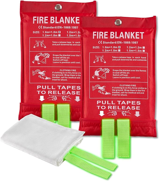 - EMERGENCY FIRE BLANKETS FOR HOME AND KITCHEN SAFETY: Fire emergency blankets are made of two layers of intricately woven glass fiber fabric and an inner layer that's made of fire-retardant film. Fire blankets work very effectively by cutting off the supply of oxygen (which the fire needs to burn) and smothering the fire. Fiberglass fire blanket for people protection while camping or cooking in kitchen, home, grill, smoker, boat, or car.
