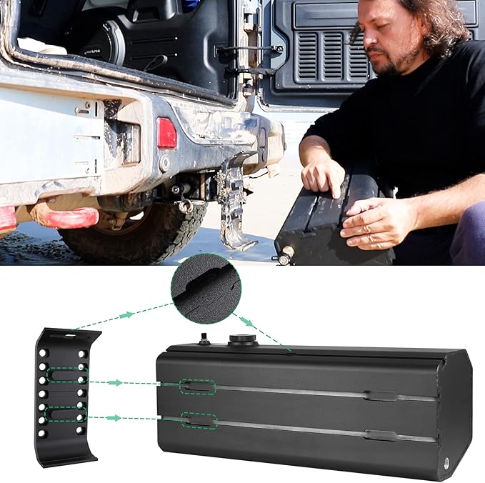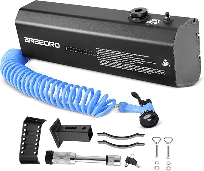 - Convenient and Portable:The pressuized water tank for your truck,SUV or off road vehicle is 25" long x9" wide x7" high,22 lbs empty, Camping shower water tank can mount to Roof Rack Mounts,Hitch Mounts,Bumper Mounts