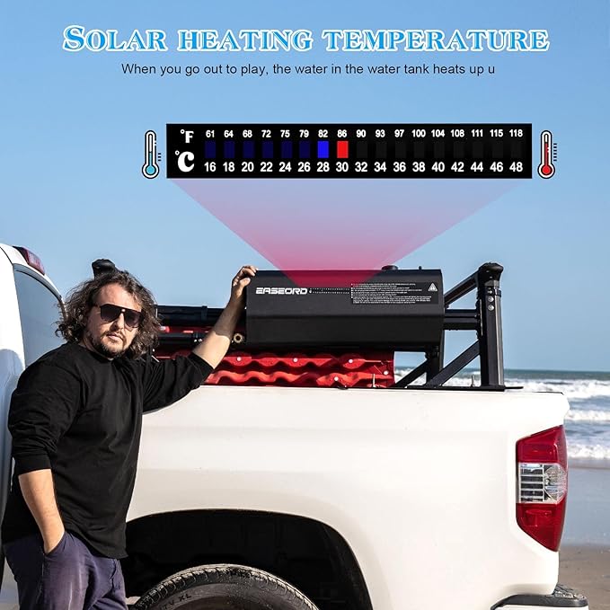 - Solar Heated Temperature: RoadShower is solar heated and has a temperature gauge on the outside so you can see how warm the water is. You can enjoy warm showers at your campsite, beach and wherever your adventures take you