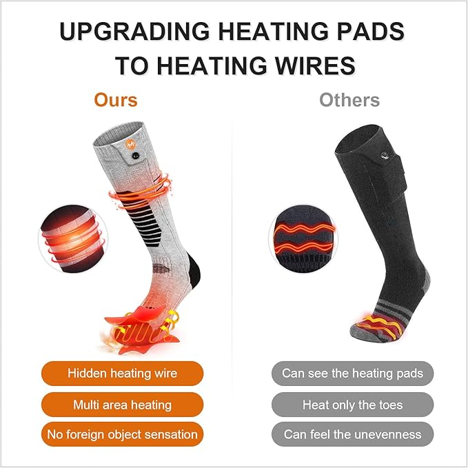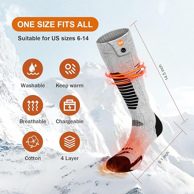 - 【PERFECT APPLICABILITY】 - Our electric heated socks are suitable for both men and women, perfect for cold winter, whether indoors or outdoors, ideal for going out, riding, motorcycling, hunting, fishing, camping, skiing, hiking, trekking, biking, allowing the warmth to spread quickly throughout the feet, and the most popular gift this winter.