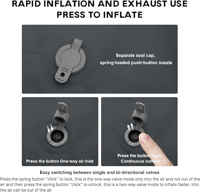 - FAST INFLATION & DEFLATION - Configured with 2.5cm adjustable inflation valve port, press the button can be one-way air intake, the inflatable process will not leak, can easily and quickly blow with the mouth to complete the inflatable. Press the button again, that is, continuous air out, fast discharge of air.