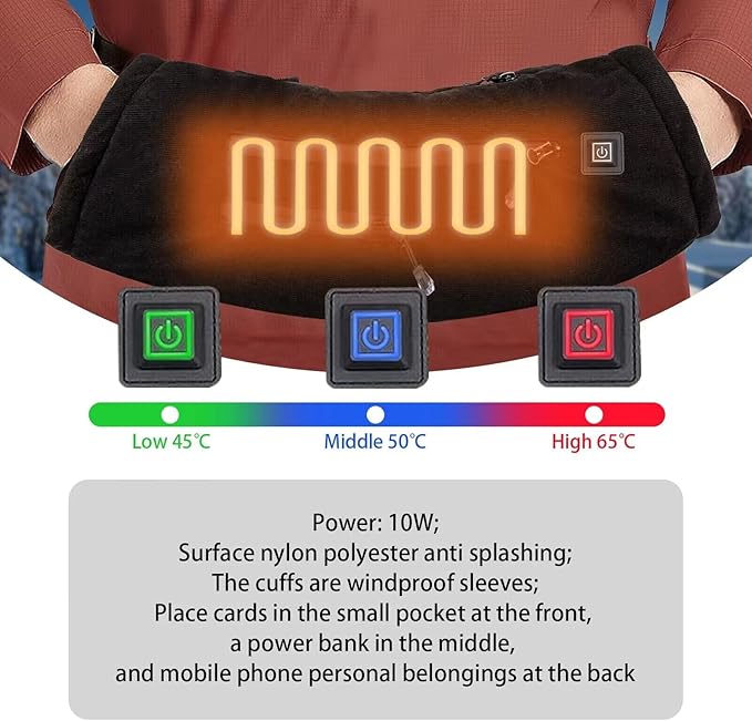 - 【3 Temperature Control】 You just need to Long press the switch button to turn on or off, short press the on/off button to adjust the temperature, it features 3 adjustable heat settings : Red - High: 65℃/149℉; Blue - Medium: 50℃/122℉; Green - Low: 45℃/113℉ . according to the environment temperature,you can easily switch it between 3 heat settings with a press of the button.This hand muff is a must have during winter. They keep your hands nice and warm even on the coldest days.