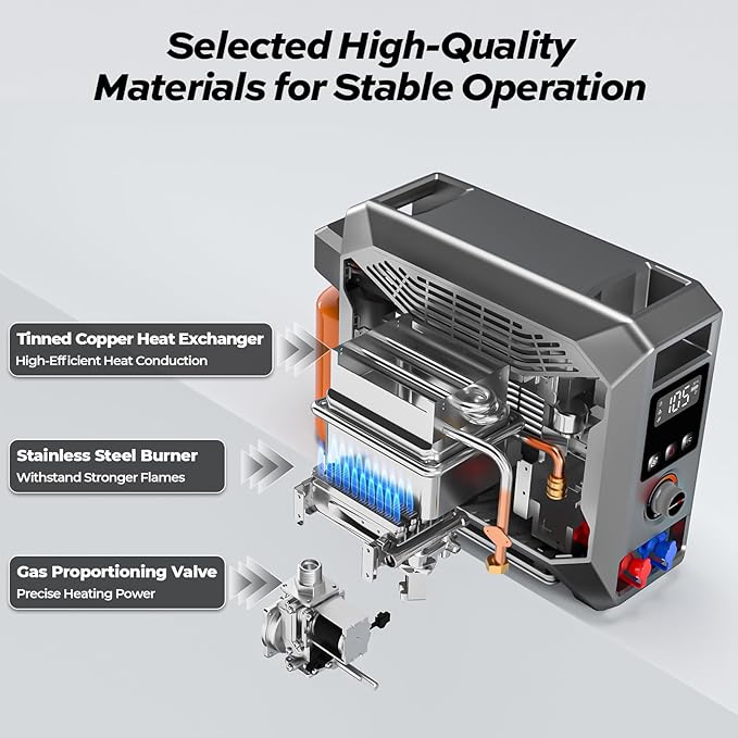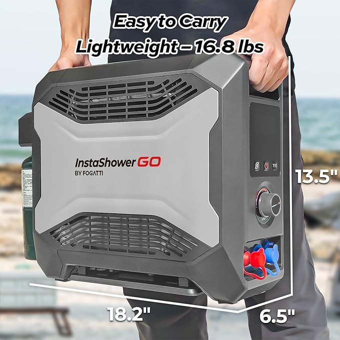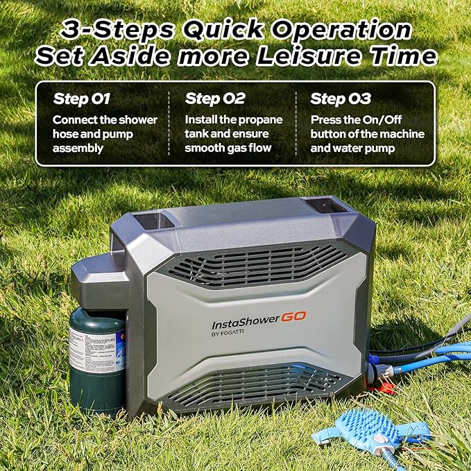 - 【Portable Shower System】FOGATTI InstaShower GO is a compact and portable shower system designed for outdoor use. Heated by propane, it provides hot water in seconds for showering, washing dishes, cleaning hands, and other tasks. It is lightweight and easy to store, making it an ideal companion for camping, hiking, and other outdoor adventures.