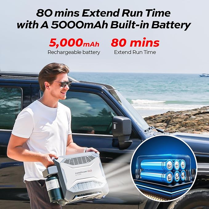 - 【Enjoy Showers Anytime, Anywhere】The FOGATTI InstaShower GO Portable Water Heater comes with a built-in 5000 mAh rechargeable battery, which eliminates the need for external power sources and can operate for 80 minutes on a full charge. This allows you to enjoy refreshing showers even at off-grid locations. It can also be charged by a 12V car cigarette lighter or a portable power station if you forget to recharge it, ensuring usability anywhere. *Please charge the battery for 4 hours at the first time to maximinize the performance of the battery.