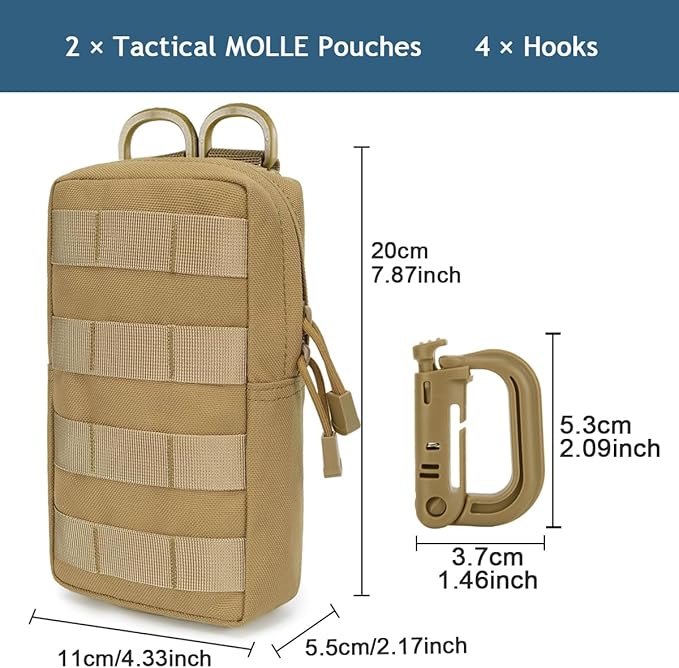 - WHAT YOU GET: The package contains 2 molle pouches, 4 quick release Carabiners. We offer fully functional tactical pouches. The military pouch connected to the Molle system can be used in combination with other equipment and accessories. You can also let your imagination run wild and attach it to your bike/motorbike or add it to your companion dog's waistcoat.