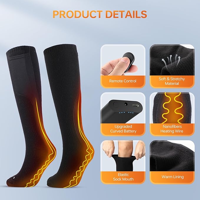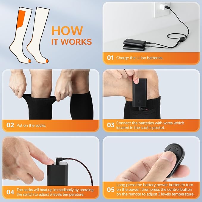 - Long-Lasting Battery Life - This battery operated heated socks with remote come with a specially designed power cable included. Simply plug it into a USB port, and it can charge two batteries simultaneously. The 4000mAh electric sock battery only takes 4 hours to recharge, ensuring that your feet stay cozy throughout your activities.