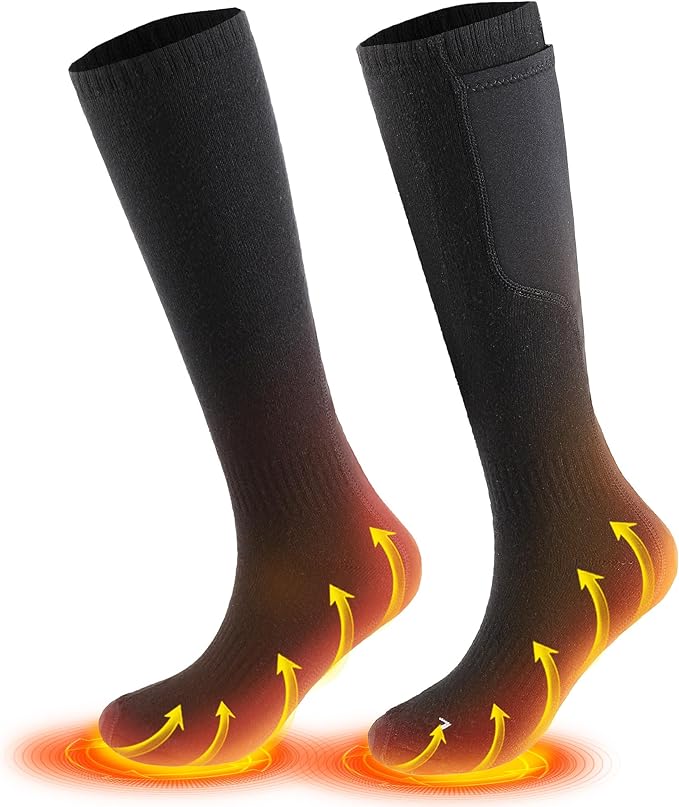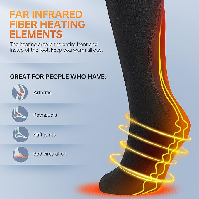 - 360° Circular Safe Heating - Our 2023 Upgraded Heated Thermal Socks now feature cutting-edge carbon fiber heating elements. and with ergonomic design, these warm socks wrap your toes, top, and bottom of your feet in soothing warmth. Experience all-around comfort as the camping heated socks warm your feet in just 30 seconds.