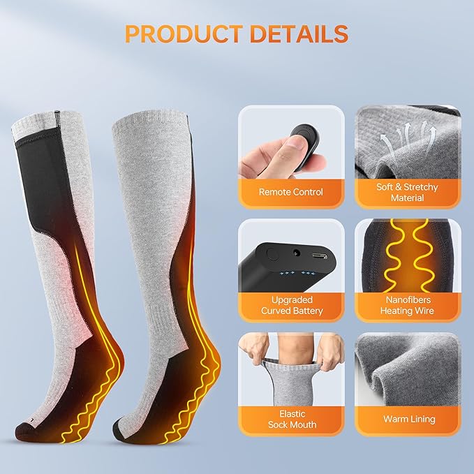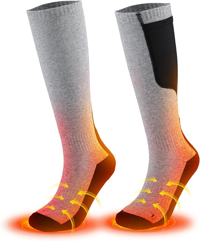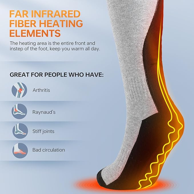 - 360° Circular Safe Heating - Our 2023 Upgraded Heated Thermal Socks now feature cutting-edge carbon fiber heating elements. and with ergonomic design, these warm socks wrap your toes, top, and bottom of your feet in soothing warmth. Experience all-around comfort as the camping heated socks warm your feet in just 30 seconds.