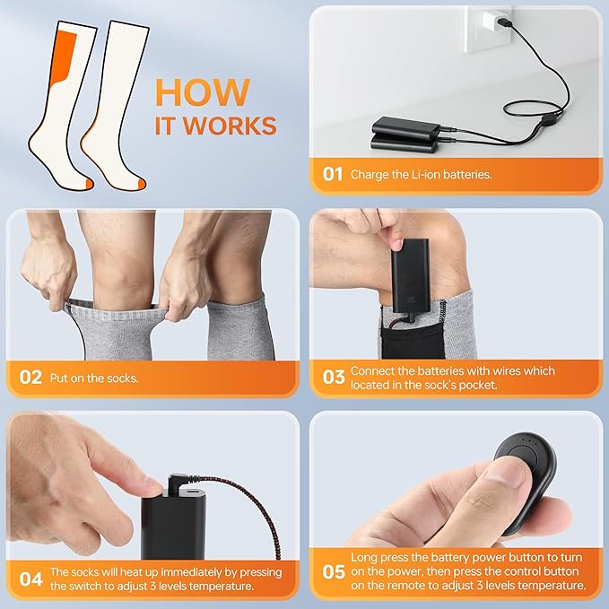 - Long-Lasting Battery Life - This battery operated heated socks with remote come with a specially designed power cable included. Simply plug it into a USB port, and it can charge two batteries simultaneously. The 4000mAh electric sock battery only takes 4 hours to recharge, ensuring that your feet stay cozy throughout your activities.