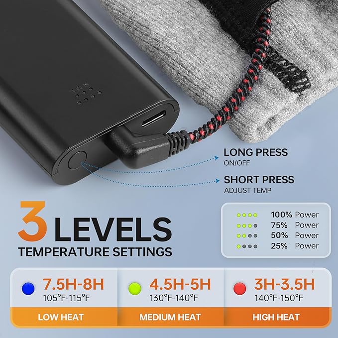 - 3-Level Heat Settings - These electric heating socks for both men and women offer 3 intelligent heating settings to keep you warm. You can choose the desired level with a touch on the built-in controller or use the remote. Select from 3-level heat settings with the simple one-button control: High, Medium, or Low, and enjoy up to 10 hours of warmth.