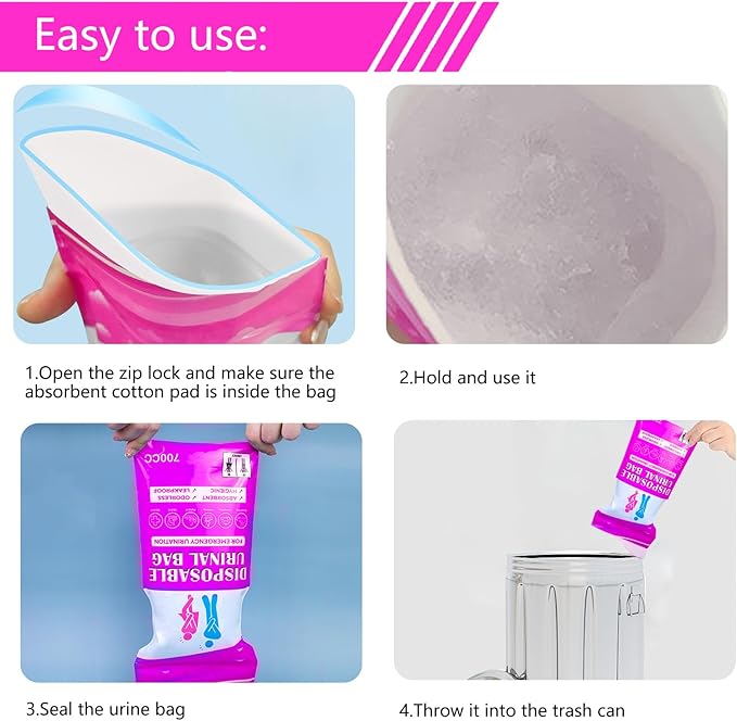 - 【Easy to use】Open the urination bag, make sure the white absorbent pad (which is SAP water-absorbing polymer substance that can absorb the liquid into gel within 45 seconds) in it. After using, pls seal it and throw urine bag in the trash can.